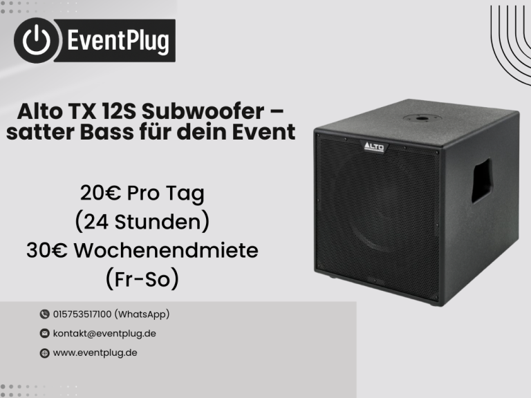 Der Alto TX 12S Subwoofer liefert druckvolle Bässe und sorgt für ein eindrucksvolles Sounderlebnis auf Ihrer Veranstaltung. Mit seinem kompakten Design und seiner starken Leistung ist er die ideale Ergänzung für Partys, Hochzeiten, Vereinsfeste oder Firmenevents.